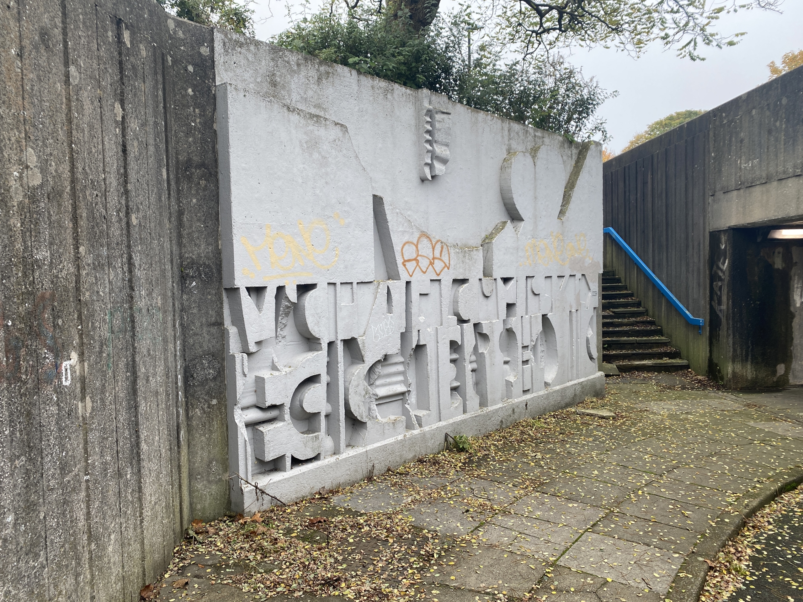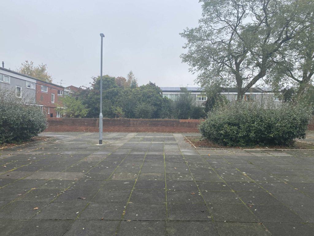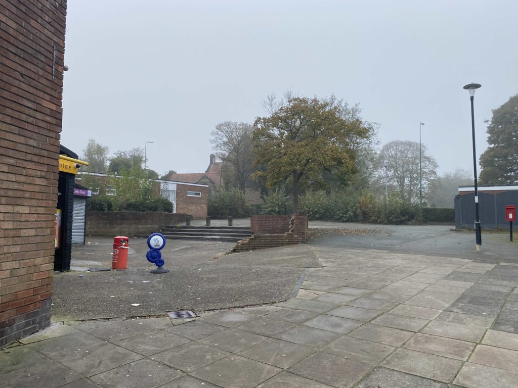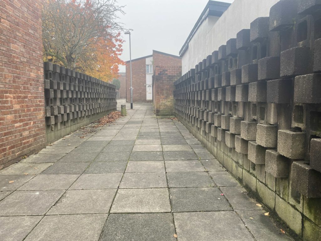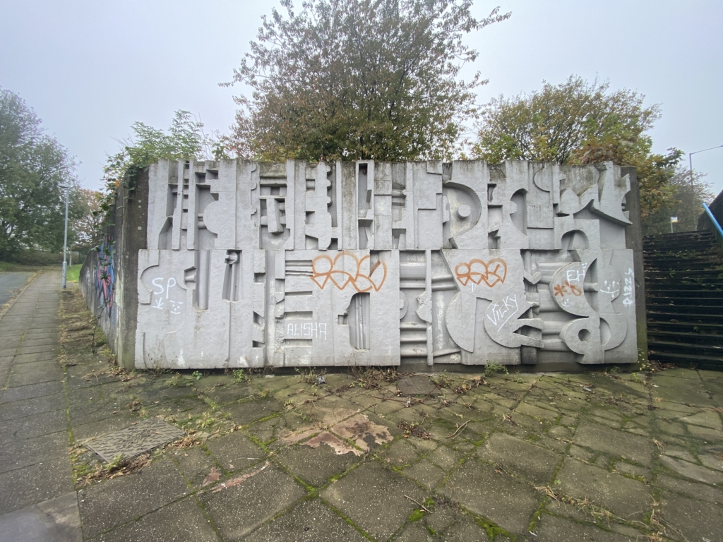 Walked through New Church Farm housing estate and towards the Mike Cumiskey concrete artworks alongside Railway Road. We discussed with Richard his interest in this architecture, how politically it could exist, what were the social reasons for a new town? What hopes and benefits did this type of modernist design bring to Skelmersdale?
